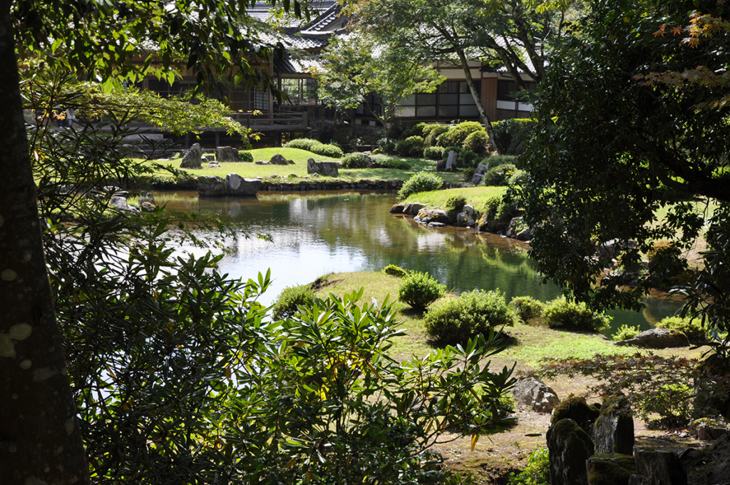 香山常栄寺(山口県山口市)は臨済宗東福寺派の寺院で毛利氏と縁が深いようですが、もともとは大内氏が建てた妙喜寺があった場所です。庭園は当時山口に滞在していた雪舟に大内政弘が依頼して造らせたと伝えられています。そのことを裏付ける同時代の文献はないようですが江戸中期頃には雪舟作となっているようです。雪舟庭園は本堂の北側、三方が林で囲まれた谷地形にあります。本堂に面した手前側は枯山水、その奥は心字池、滝組がある池泉回遊式で42,497㎡(史跡・名勝指定面積)の広さです。ちなみに本堂南側は重森三玲による南冥庭となっています。