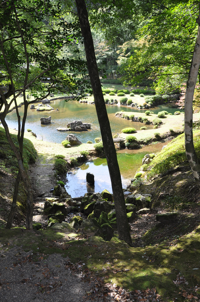 池泉回遊式と書きましたが、現在、池の周りを歩きまわることはできません。その代わりに庭を取り囲むように山畔に歩道がありますから、池中の亀石・舟石・鶴石はもとより、滝石組の上から庭を眺めることができます。池の北西から西側にかけてサツキの刈込があり、後世のもののようで刈込自体は美しいのですが室町中期の庭には似つかわしくないように思えました。