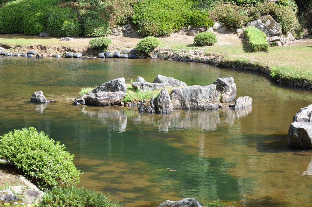 枯山水の東側と池の西側には、かつて書院と楼閣が建っていたようで、少しだけ空間が間延びした印象があります。ちなみに楼閣の閣は重層の建物に使います。似た言葉で塔がありますが塔はもともと仏塔のことですし重層ではありません(五重塔は平屋建)。