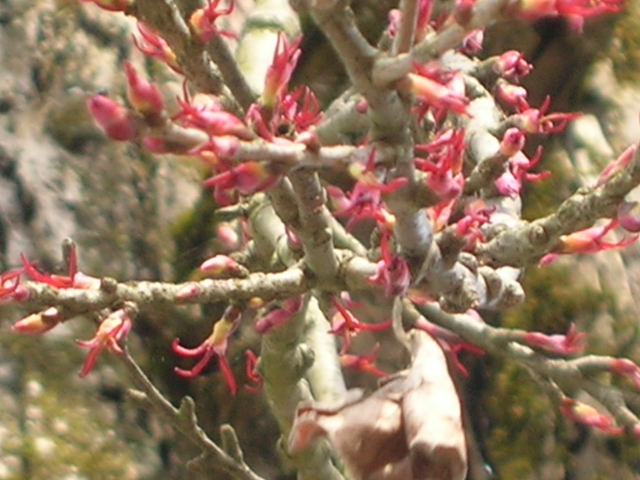 カツラは若葉が出る前に小さな花を咲かせます。花といっても萼や花弁はないのですが、雄蕊の葯・雌蕊の柱頭が赤く色づき、遠目だと茜色に見えます。(カツラは雌雄異株・花は風媒花)